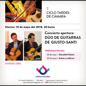 Eventos en 18 mayo, 2018 Navegación de búsqueda y vistas de Eventos Mostrar la búsqueda de Eventos Búsqueda de Eventos Día de Navegación de vistas de Evento Ver como ListaMesDía « Día anterior Siguiente día » Todo el día La celebración del arte 19 abril, 2018 - 25 mayo, 2018 Usina Cultural, Av Sabattini 51 Villa María, Córdoba 5900 Argentina + Google Map En salas hasta el viernes 25 de mayo - Lunes a viernes de 8 a 20 horas Más información » 20:00 Apertura Tardes de Cámara 18 mayo, 2018 /20:00 - 21:30 Usina Cultural, Av Sabattini 51 Villa María, Córdoba 5900 Argentina + Google Map Más información » + Exportar eventos