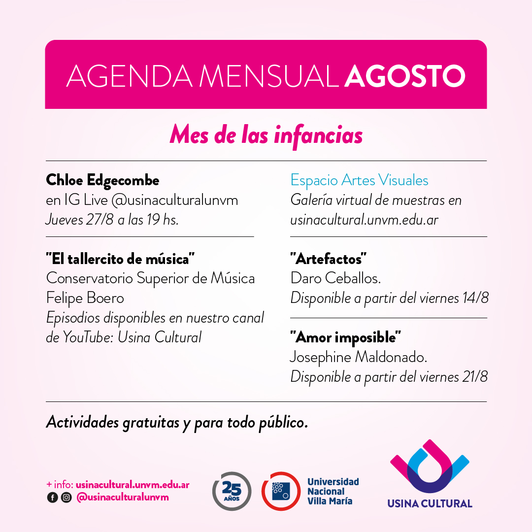 « Todos los Eventos Este evento ha pasado. Mes de las infancias 18 agosto, 2020 - 31 agosto, 2020 Navegación del Evento « Muestra virtual «Artefactos» Daro Ceballos Muestra virtual «Amor imposible» Josephine Maldonado » + Google Calendar+ Exportación de iCal Detalles Comienza: 18 agosto, 2020 Finaliza: 31 agosto, 2020