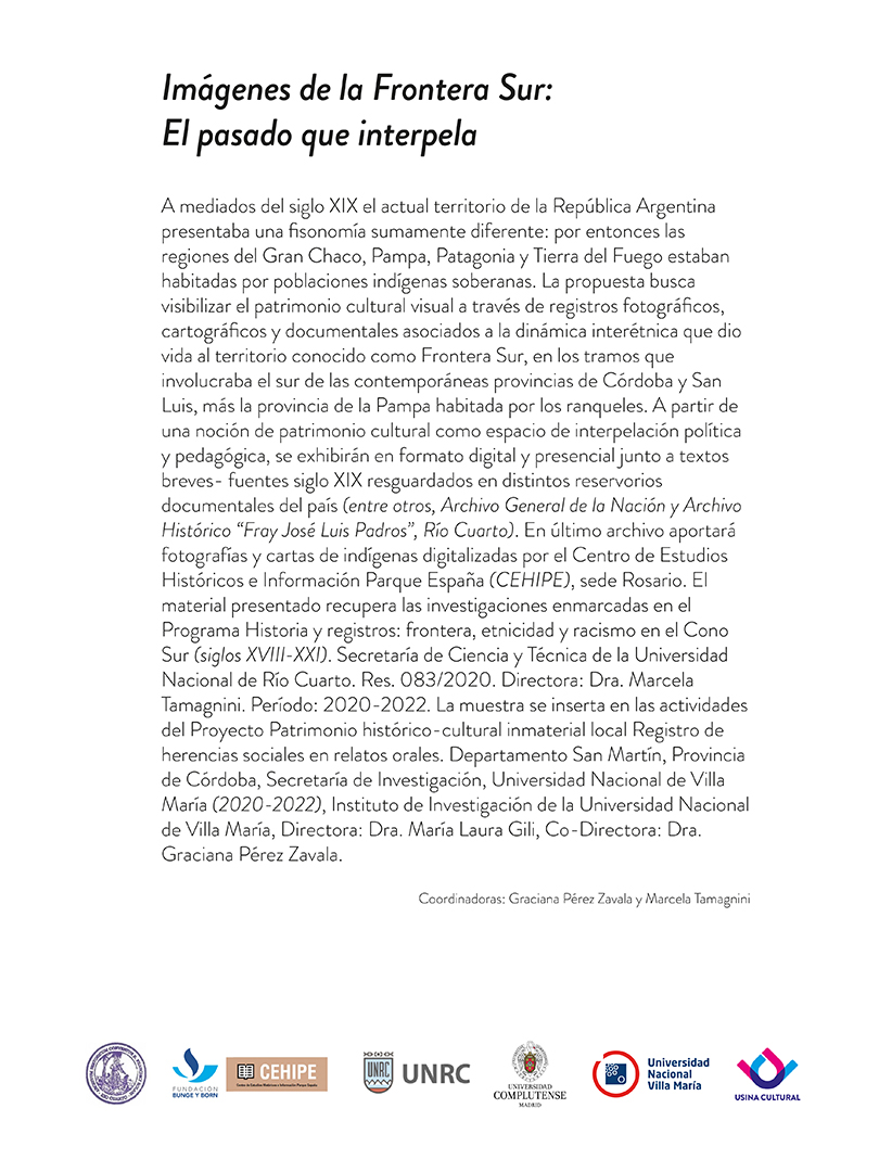 La muestra “Imágenes de la frontera sur: el pasado que interpela” busca visibilizar el patrimonio cultural visual a través de registros fotográficos, cartográficos, documentales y orales asociados a la dinámica interétnica que dio vida al territorio conocido como Frontera Sur, en los tramos que involucraba el sur de las contemporáneas provincias de Córdoba y San Luis, más la provincia de la Pampa habitada por los ranqueles.