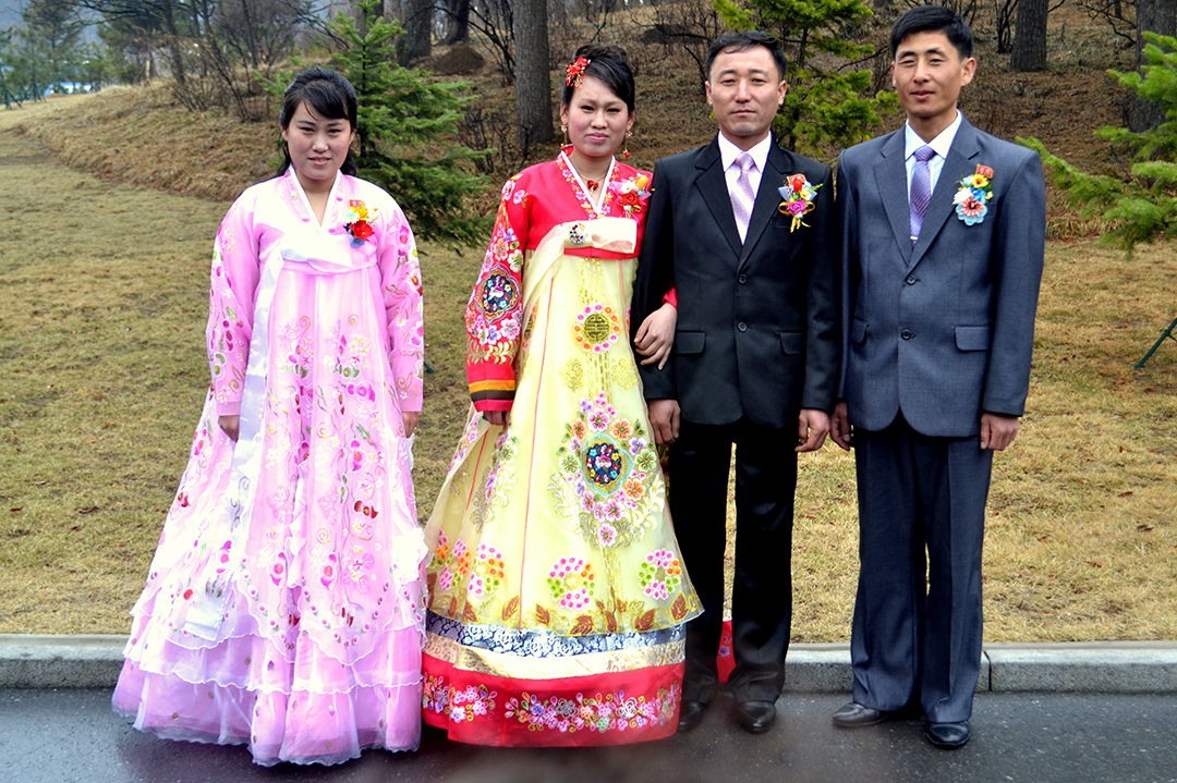 Los casamientos en Corea del Norte se celebran con autorización de los padres de la novia y del Partido de los Trabajadores. Los recién casados, en esta foto, caminan hacia el Gran Monumento de la colina Mansudae a rendir tributo a Kim Il Sung y Kim Jong Il.